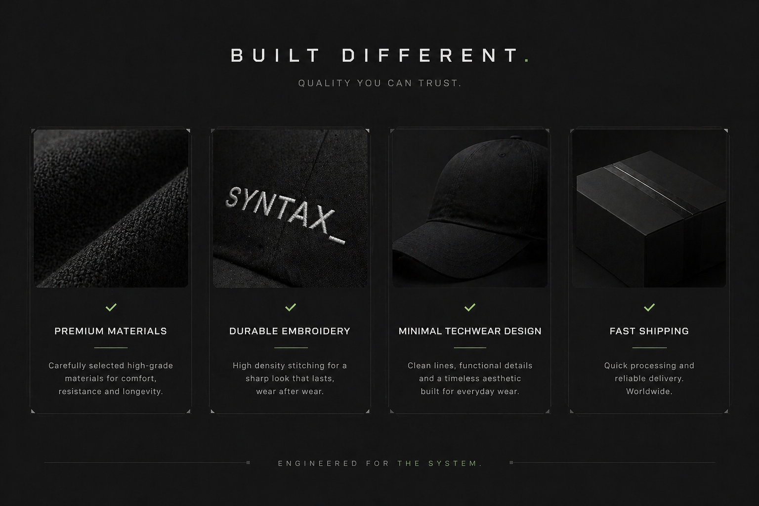 SYNTAX is a techwear headwear brand built for precision and identity. Inspired by code, structure, and minimal systems, each piece is designed to integrate seamlessly into your daily uniform.